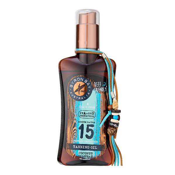 Aceite bronceador de coco Byron Bay SPF 15. Consigue el bronceado perfecto.