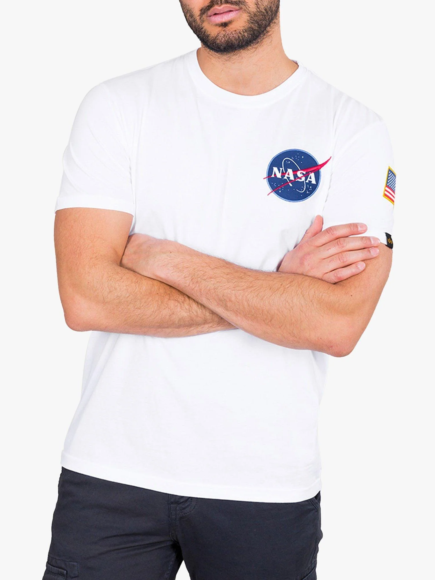 Texto de venta: Camiseta de manga corta y cuello redondo para hombre, colaboración entre Alpha Industries y la NASA, con parche de la NASA en el pecho y estampado reflectante de la NASA en el pecho.