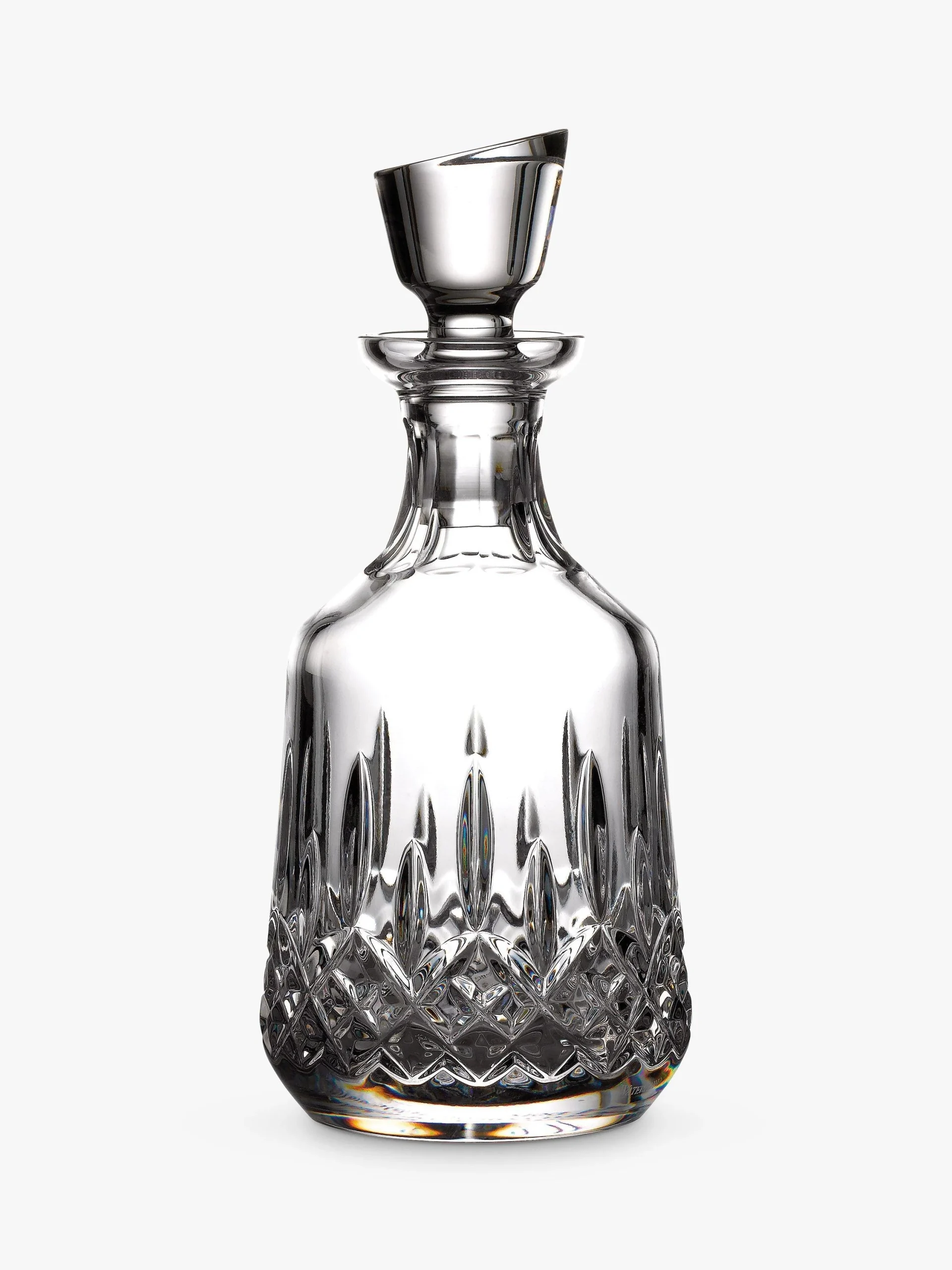 Un pequeño decantador artesanal con forma de botella y tapón de cristal que presenta los cortes de diamante y cuña característicos de la colección Lismore.
