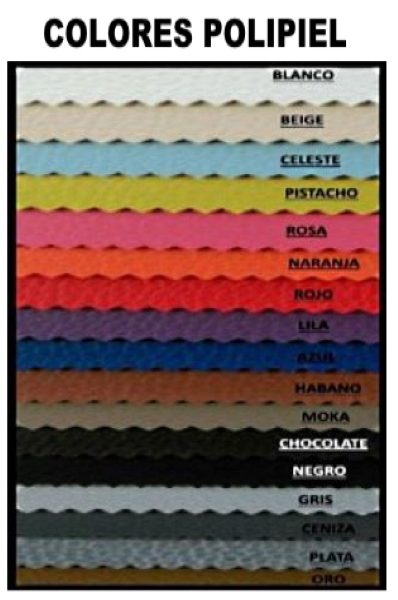 | COLOR POLIPIEL | Azul, Beige, Blanco, Celeste, Ceniza, Chocolate, Gris, Habano, Lila, Moka, Naranja, Negro, Oro, Pistacho, Plata, Rojo, Rosa |