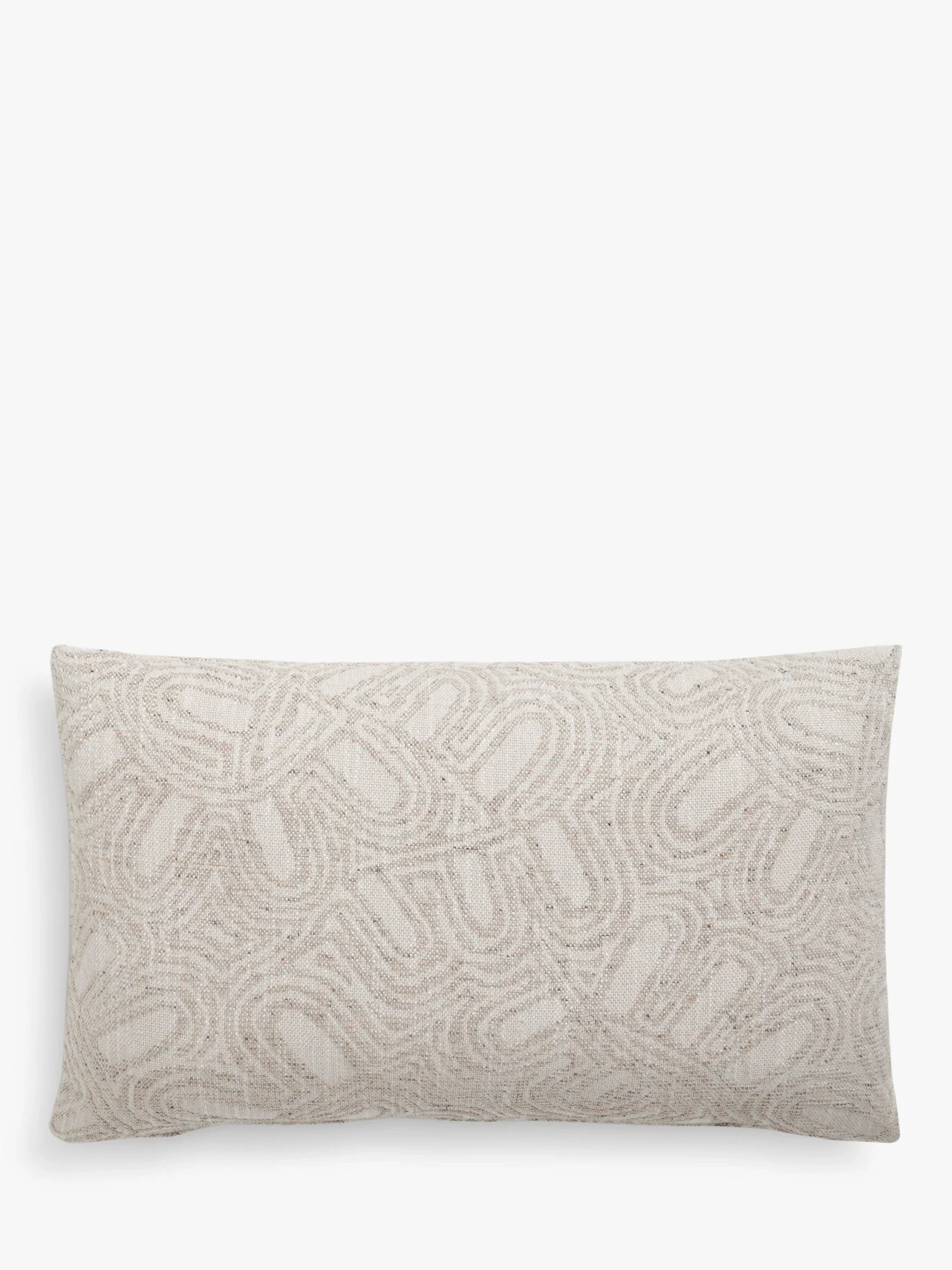 Un diseño geométrico de bucles serpentea a lo largo de este cojín. Tejido con una mezcla de fibras, incluido el lino, añadirá una textura sutil a un sofá liso tapizado en tela.