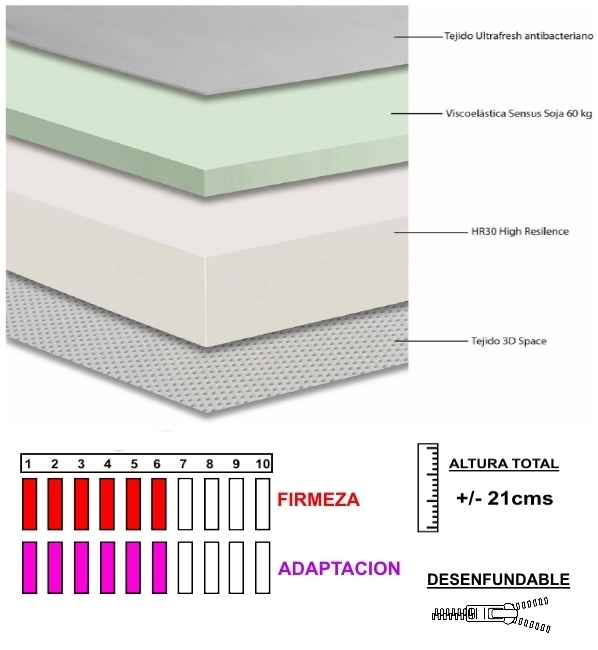 Este colchón de 21 cm de altura está compuesto por 5 cm de viscoelástica Sensus Soja de 70 Kg de densidad termovariable y transpirable reforzada con un núcleo inferior perfilado de auténtico HR de 30 kg/m³ de 15 cms de espesor.