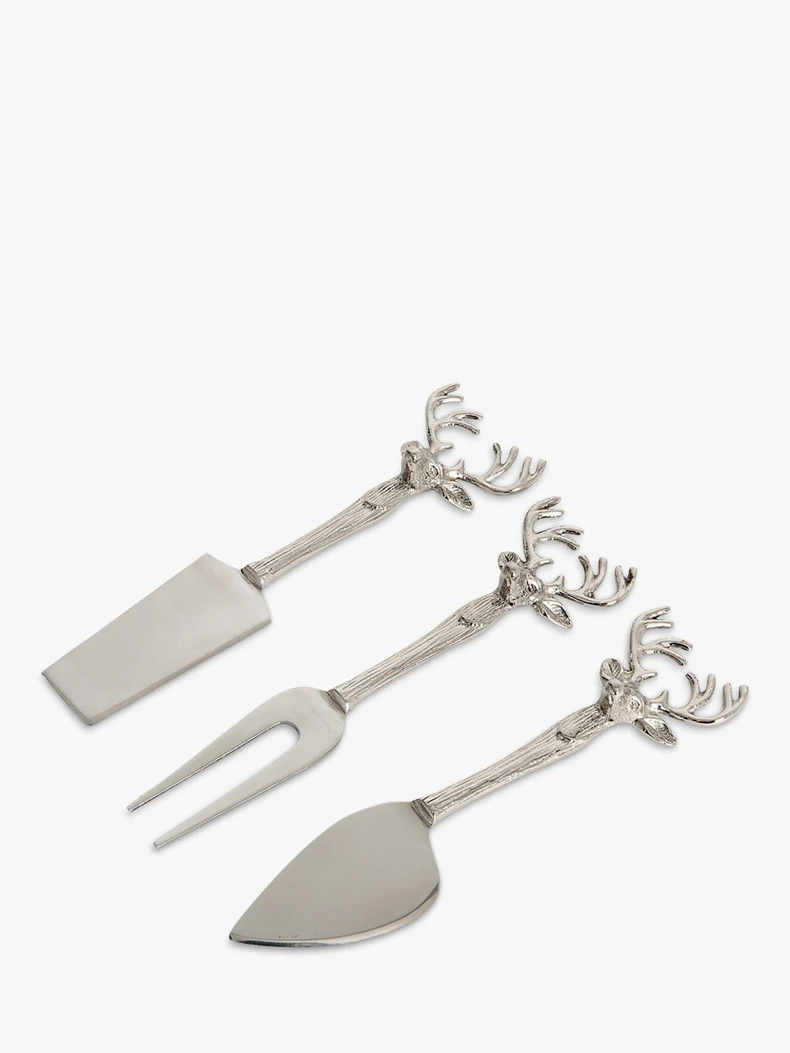 Inspirado en la majestuosidad y belleza de un ciervo, este juego de cuchillos para queso de Culinary Concepts impresionará a sus invitados con su deslumbrante diseño. Cada cuchillo cuenta con un elegante mango en forma de ciervo, intrincadamente decorado y con un acabado plateado de alta calidad.
