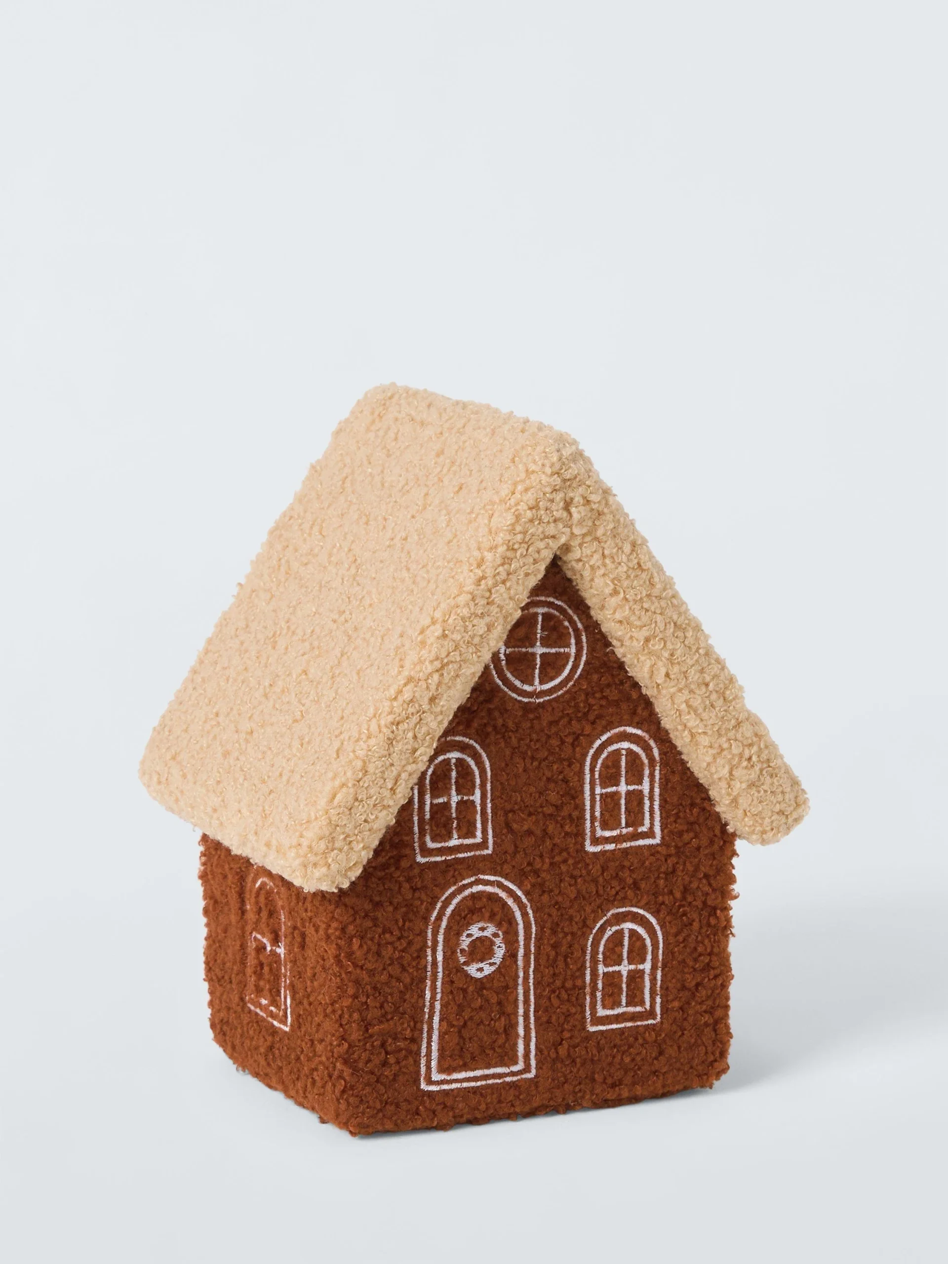 Esta casita de jengibre está cubierta de una tela bouclé suave y afelpada. ¿Por qué no integrarla en una decoración tradicional con bastones de caramelo y figuras de jengibre?