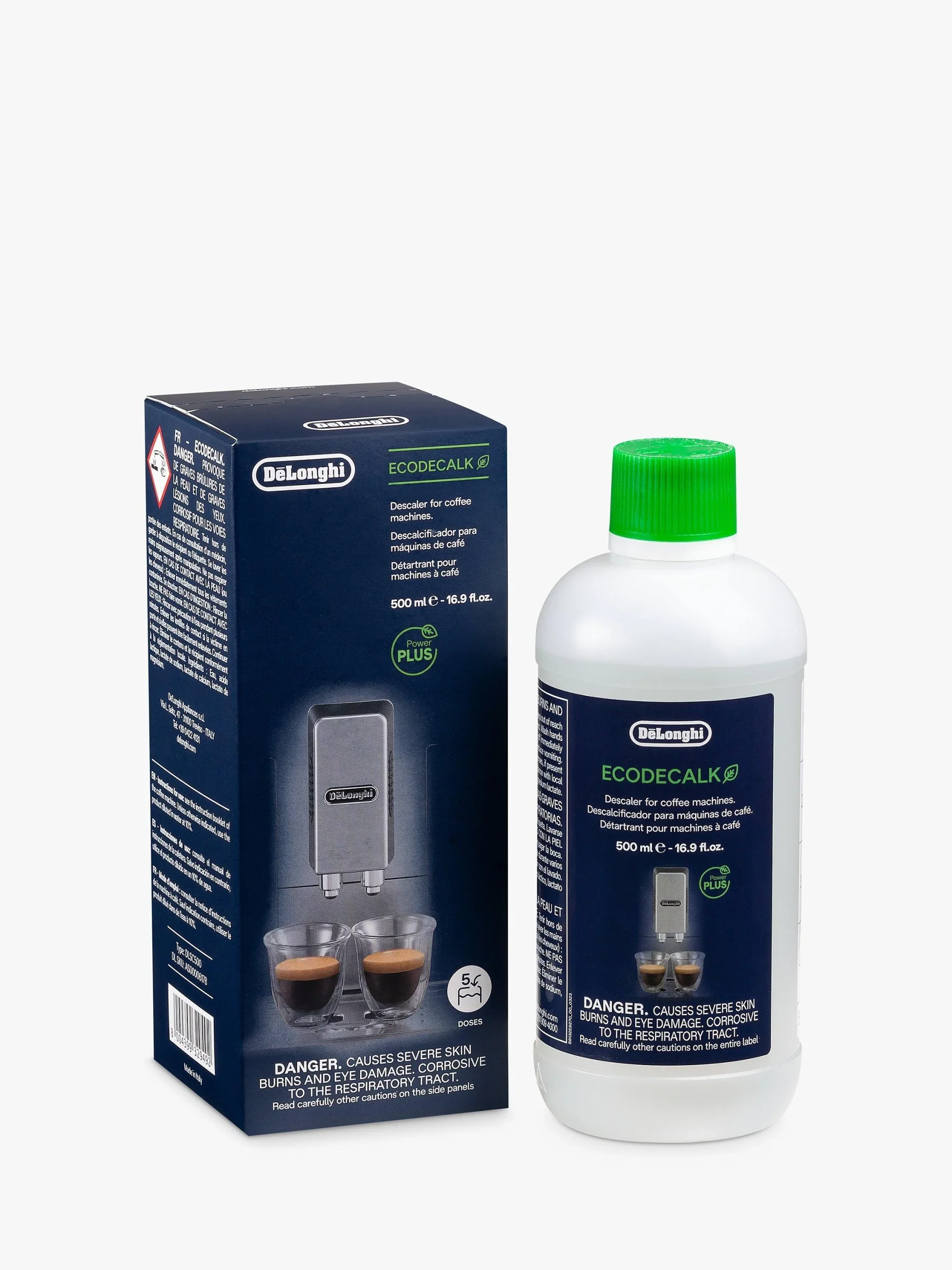 El líquido descalcificador para cafeteras De’Longhi EcoDecalk, usado regularmente, reduce significativamente la probabilidad de averías prematuras por acumulación de cal, aumenta la eficiencia energética y mejora el sabor y la crema del café.