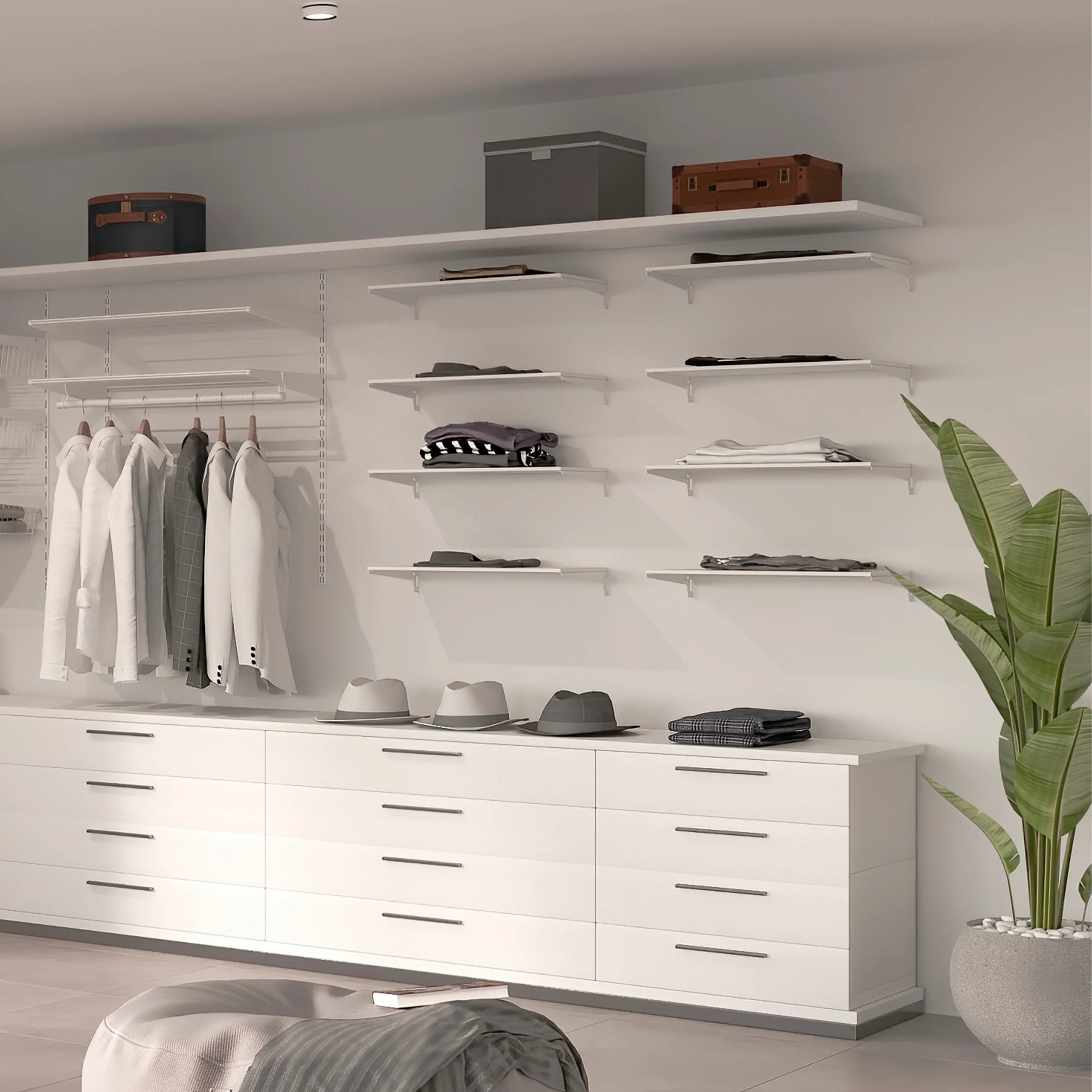 Kit de accesorios para realizar estanterías a medida fijadas en la pared. Son ideales para equipar el interior de armarios, vestidores, cuartos de lavado o despensas. Se pueden combinar con los accesorios Jagmet para realizar una amplia gama de composiciones.