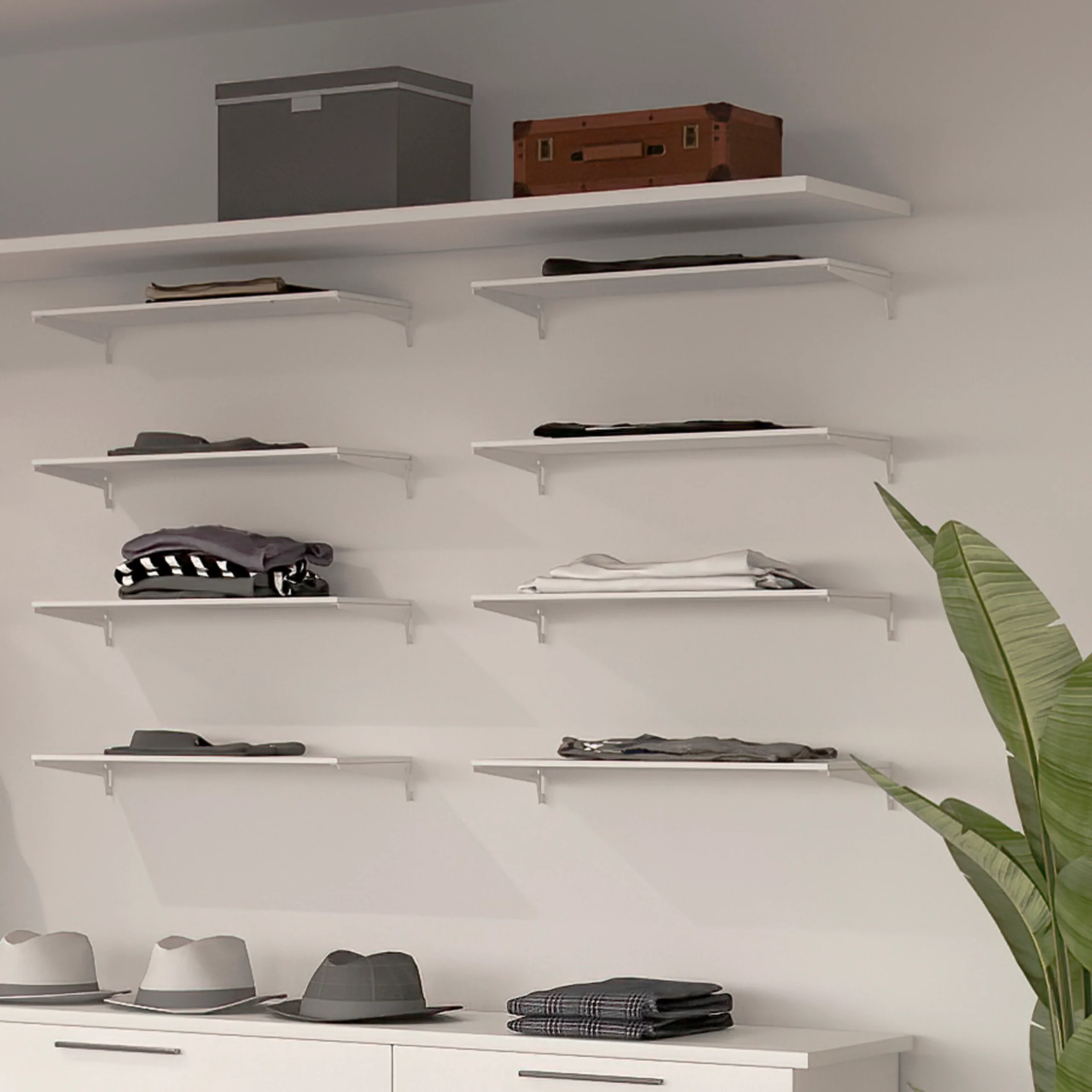 Kit de accesorios para realizar estanterías a medida fijadas en la pared. Son ideales para equipar el interior de armarios, vestidores, cuartos de lavado o despensas. Se pueden combinar con los accesorios Jagmet para realizar una amplia gama de composiciones.