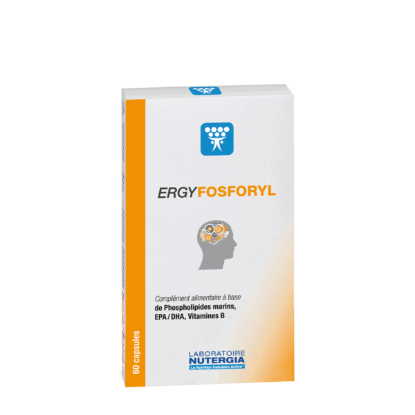Ergyfosforyl refuerza las funciones cerebrales y contribuye a una mejora de la memoria y la concentración gracias a un ingrediente innovador exclusivo, que asocia fosfolípidos, DHA y aceites de pequeños pescados salvajes ricos en omega 3, el Cogni-Phos.