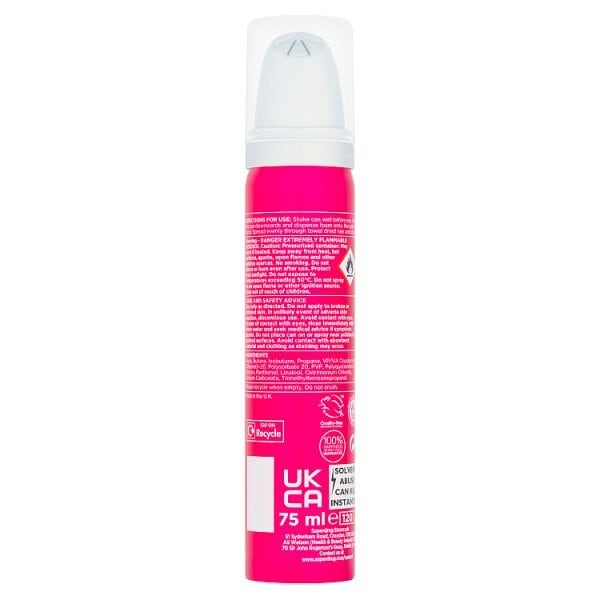 INGREDIENTES: Agua, butano, isobutano, propano, copolímero VP/VA, ceteareth-20, polisorbato 20, PVP, policuaternio-16, perfume, pantenol, linalol, cloruro de cetrimonio, carbonato de sodio, trimetilbencenopropanol