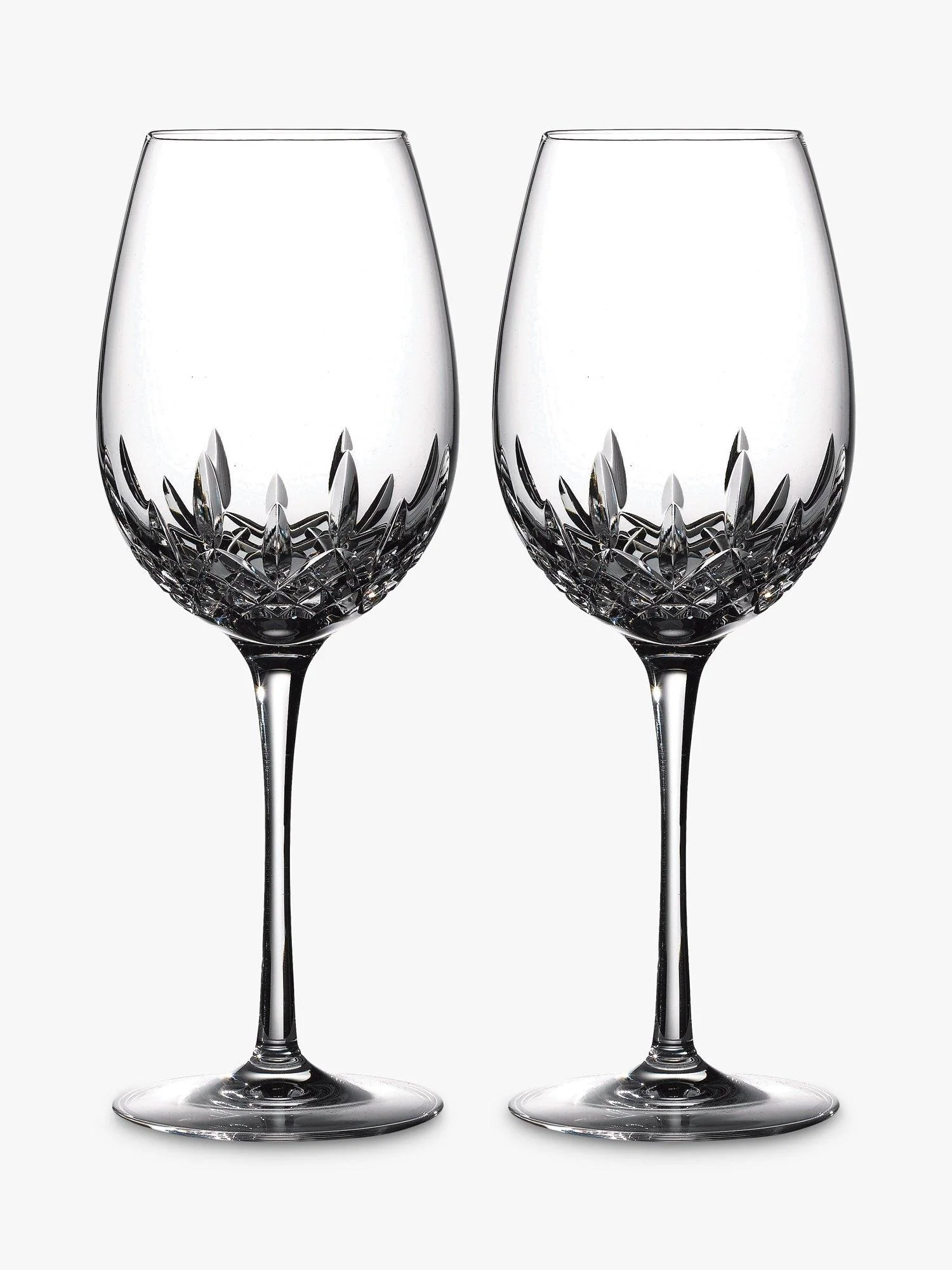 Un par de copas de vino tipo balón de la colección Lismore Essence de Waterford Crystal. Con paredes más claras, tallo fino y cáliz redondeado, estas copas realzan el color, la claridad y el disfrute tanto de los mejores vinos tintos como de los blancos.