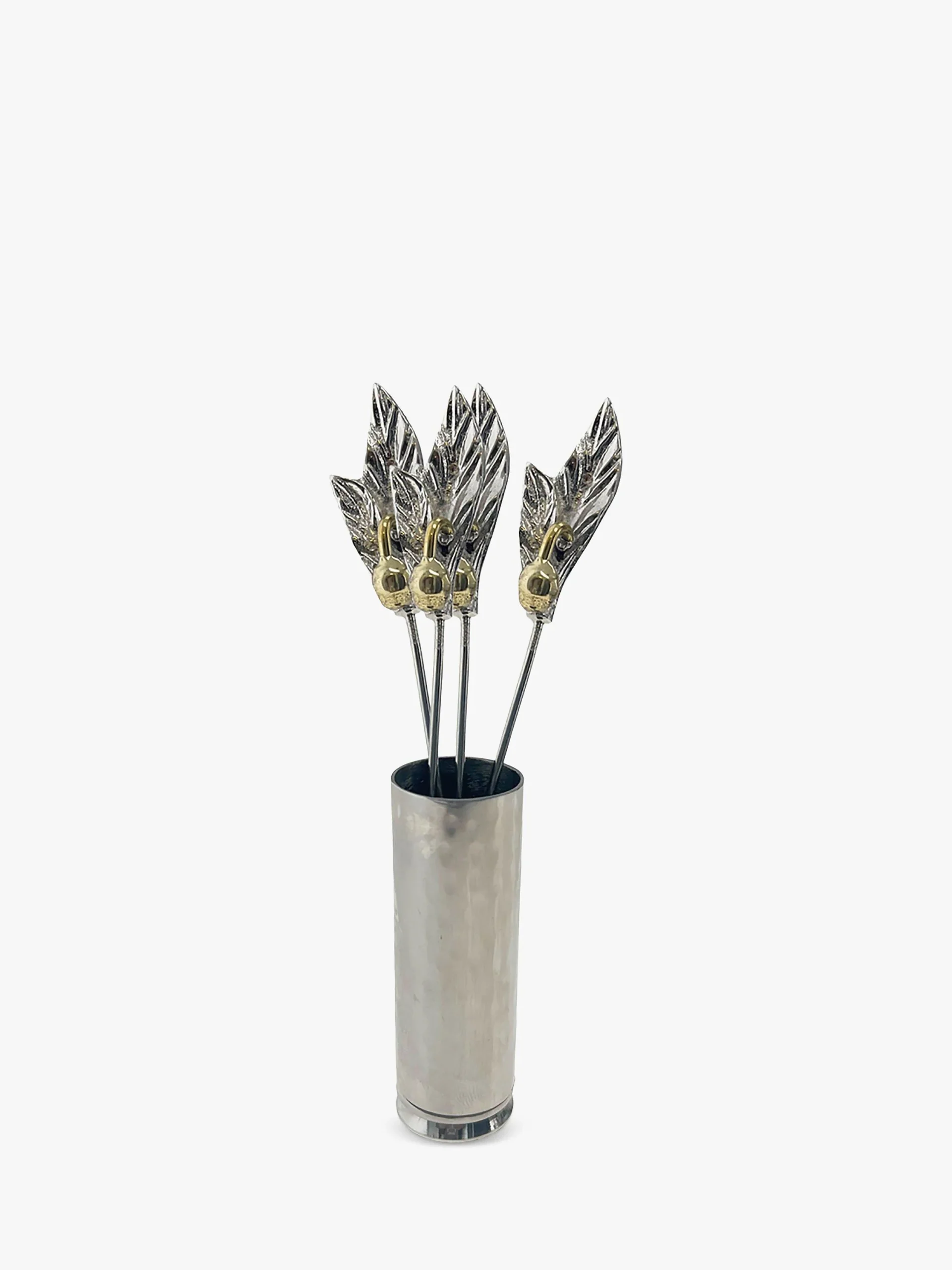 Palillos para aceitunas de Culinary Concepts, con un intrincado diseño de hoja y aceituna en latón. Fabricados en acero inoxidable, se guardan juntos en un soporte a juego y el conjunto se presenta en una caja de regalo.