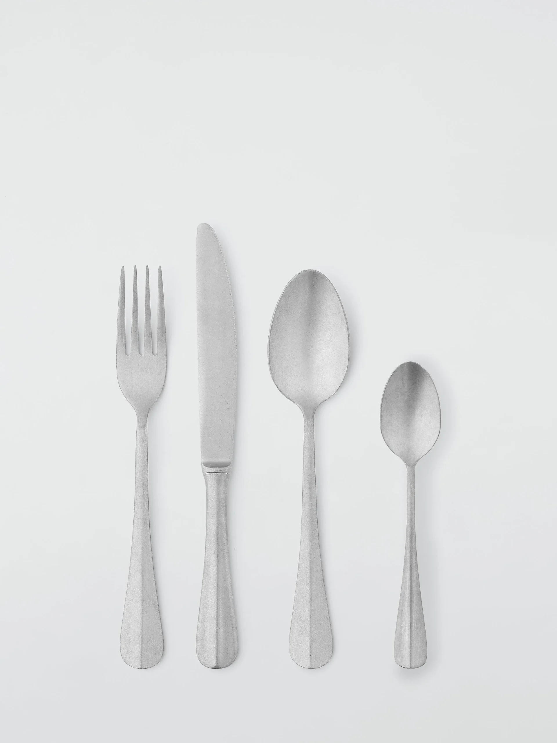 Juego de cubiertos de cuatro piezas con acabado lavado a la piedra. Apto para lavavajillas para una limpieza fácil e higiénica.
