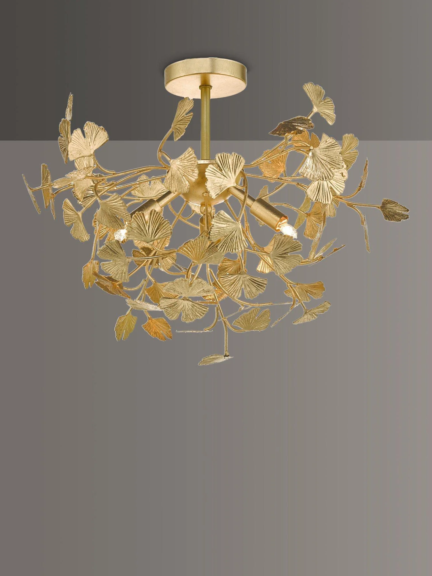 Con un delicado diseño de hojas y ramitas entrelazadas, esta lámpara de techo aportará un toque decorativo a tu espacio. Está fabricada en metal con pan de oro aplicado a mano para lograr un acabado envejecido. Además, iluminará toda la habitación, ya que requiere cuatro bombillas.