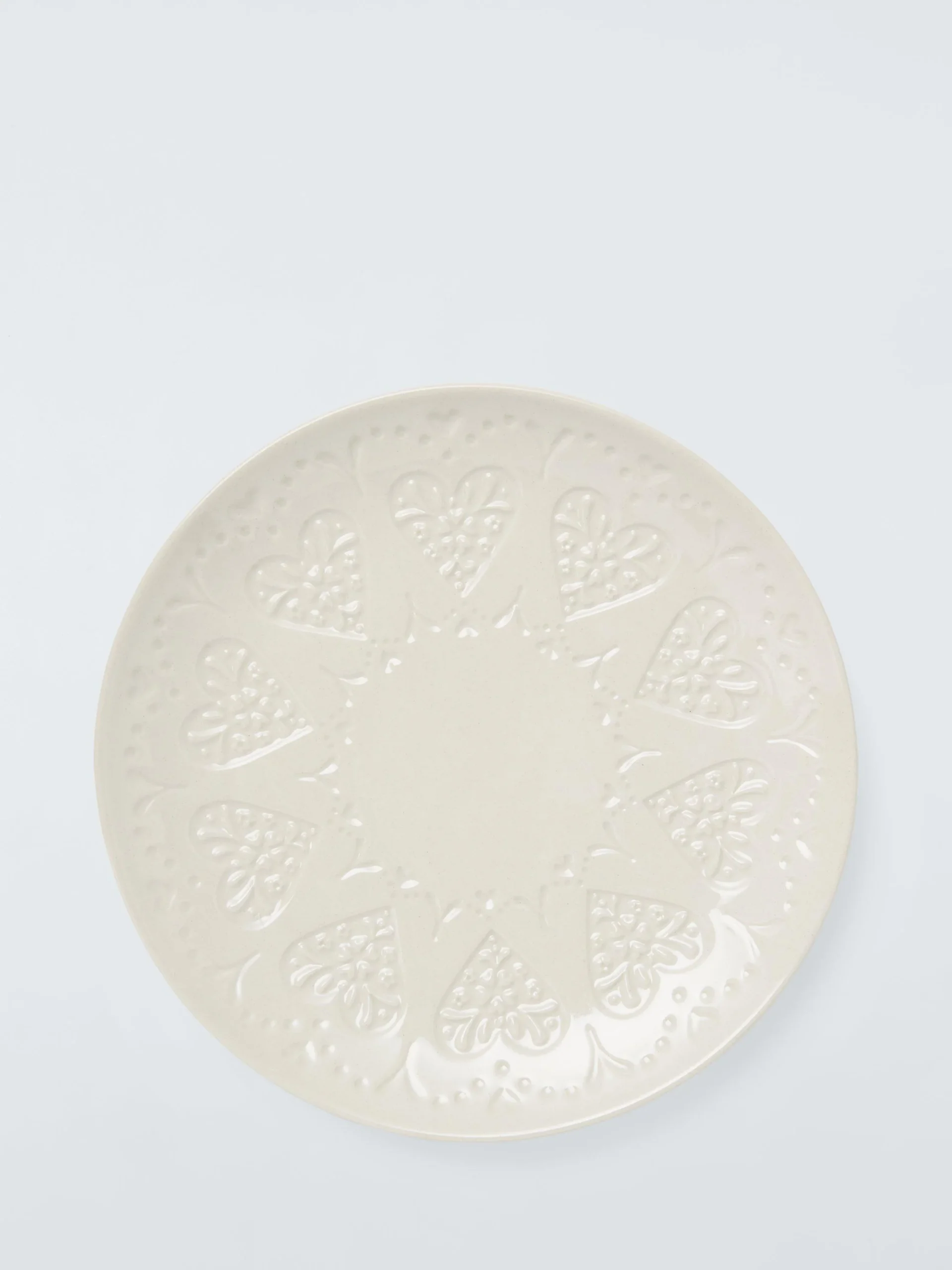 Plato lateral esmaltado con motivos de corazones en relieve y un bonito diseño. Fabricado en gres, es apto para lavavajillas y microondas, ideal para uso diario.