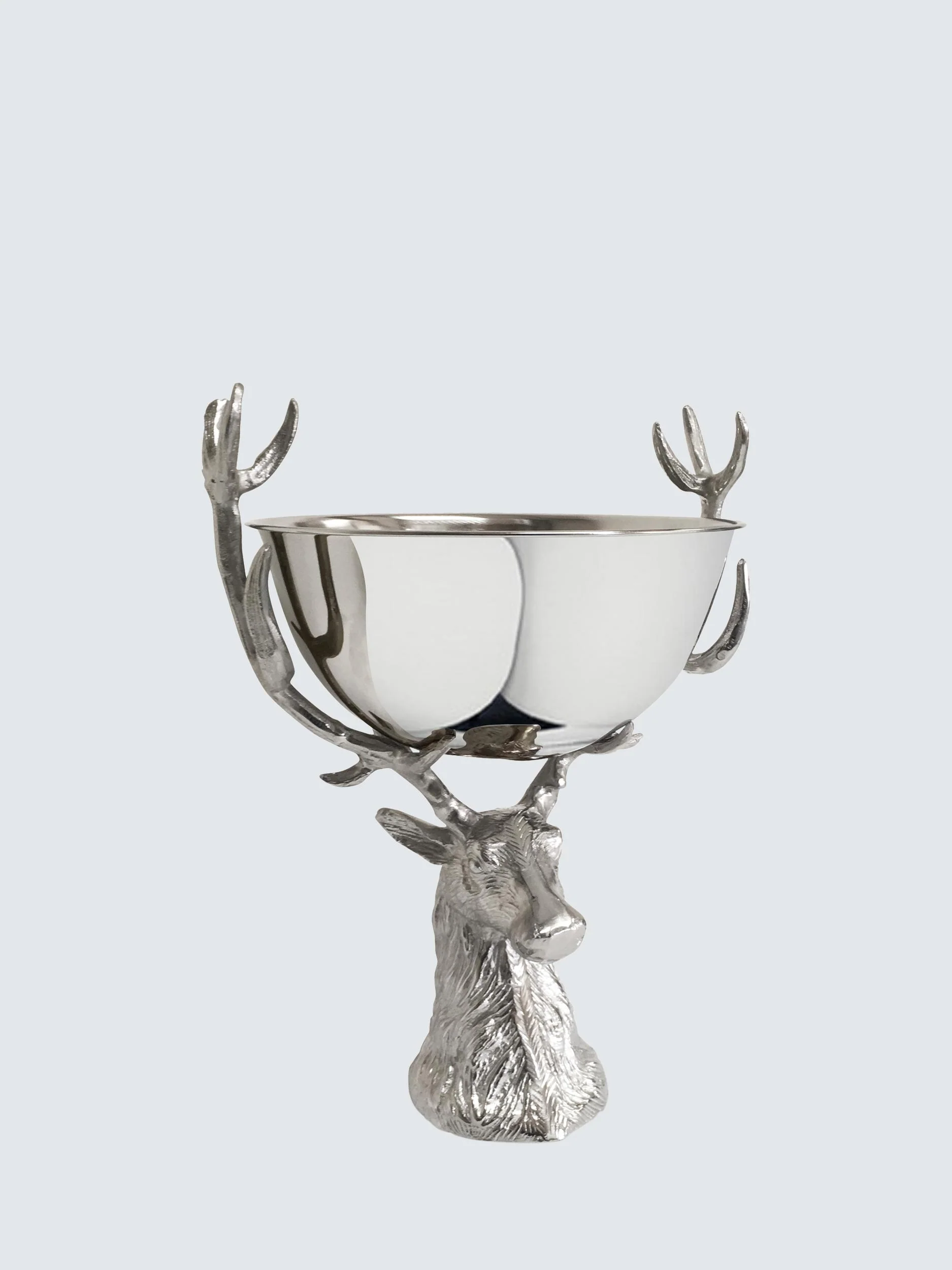 La magnífica cabeza de ciervo, elaborada en aluminio niquelado, sostiene con sus robustas astas el cuenco de acero inoxidable. Con detalles intrincados que ilustran a la perfección la calidad artesanal característica de Culinary Concepts, esta pieza sin duda impresionará. El cuenco extraíble tiene capacidad para hasta tres botellas de vino estándar, o, al ser apto para alimentos, puede usarse como una elegante frutera o ponchera; cualquier delicia culinaria que se atreva a presentar con tal distinción.