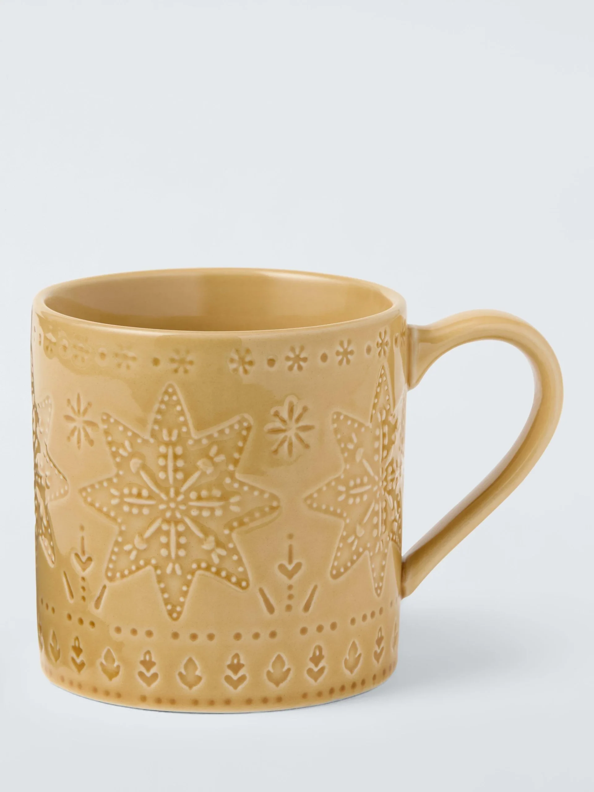 Esta taza, decorada con un diseño de copo de nieve y estrella en relieve y con un acabado brillante, es ideal para regalar y perfecta para bebidas festivas. Fabricada en gres, es apta para lavavajillas y microondas.