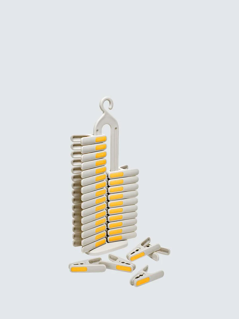 El organizador de pinzas incluye 30 pinzas resistentes a los rayos UV que se sujetan a un innovador soporte, manteniéndolas perfectamente organizadas. Una vez colocadas, cada pinza se desliza fácilmente por el soporte hasta quedar al alcance de la mano, lista para usar. El soporte también cuenta con un gancho integrado en la parte superior, lo que permite colgarlo cómodamente del tendedero.