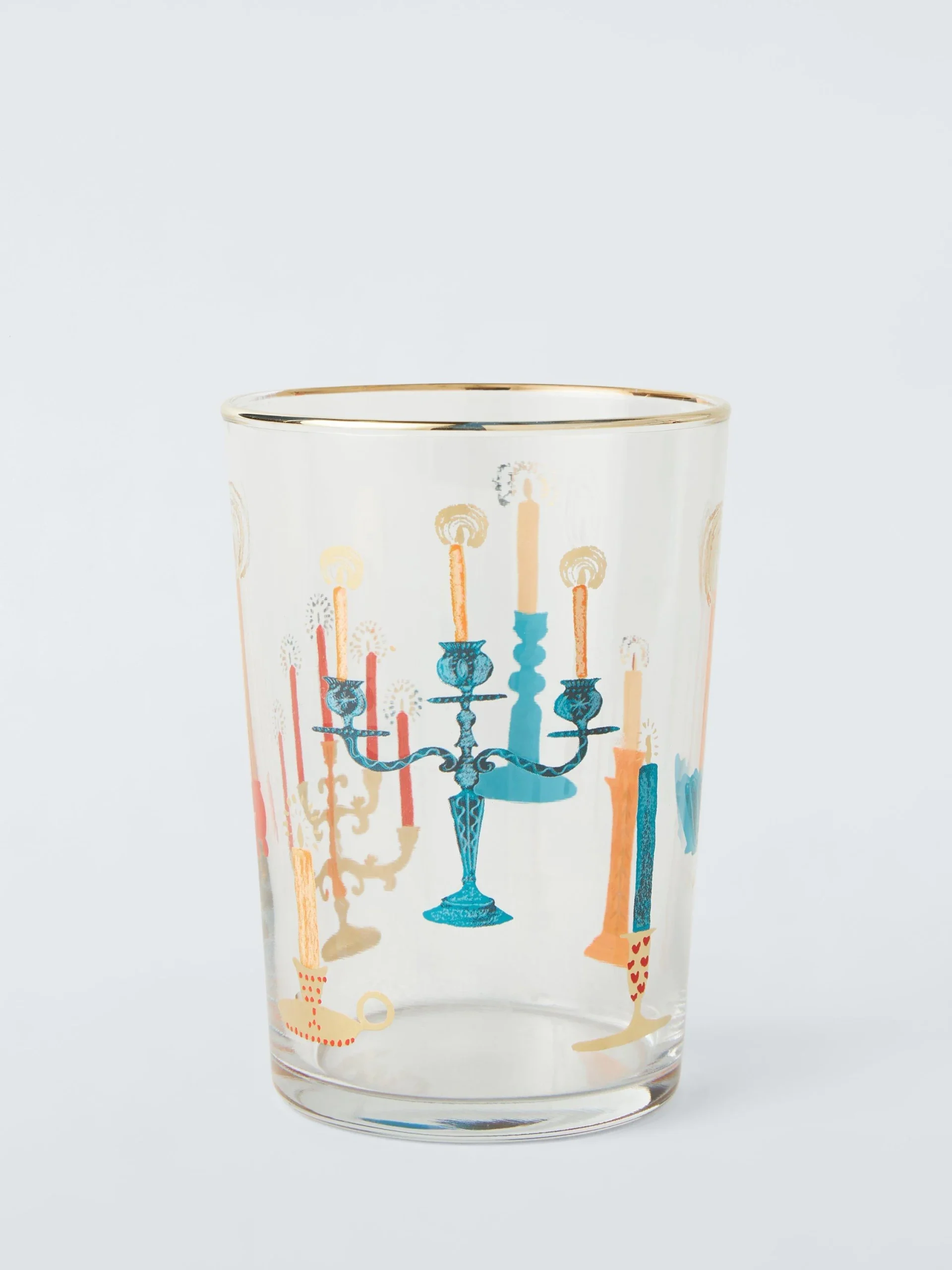 Vaso de cristal serigrafiado con nuestro diseño de vela. Acabado con un festivo borde dorado.