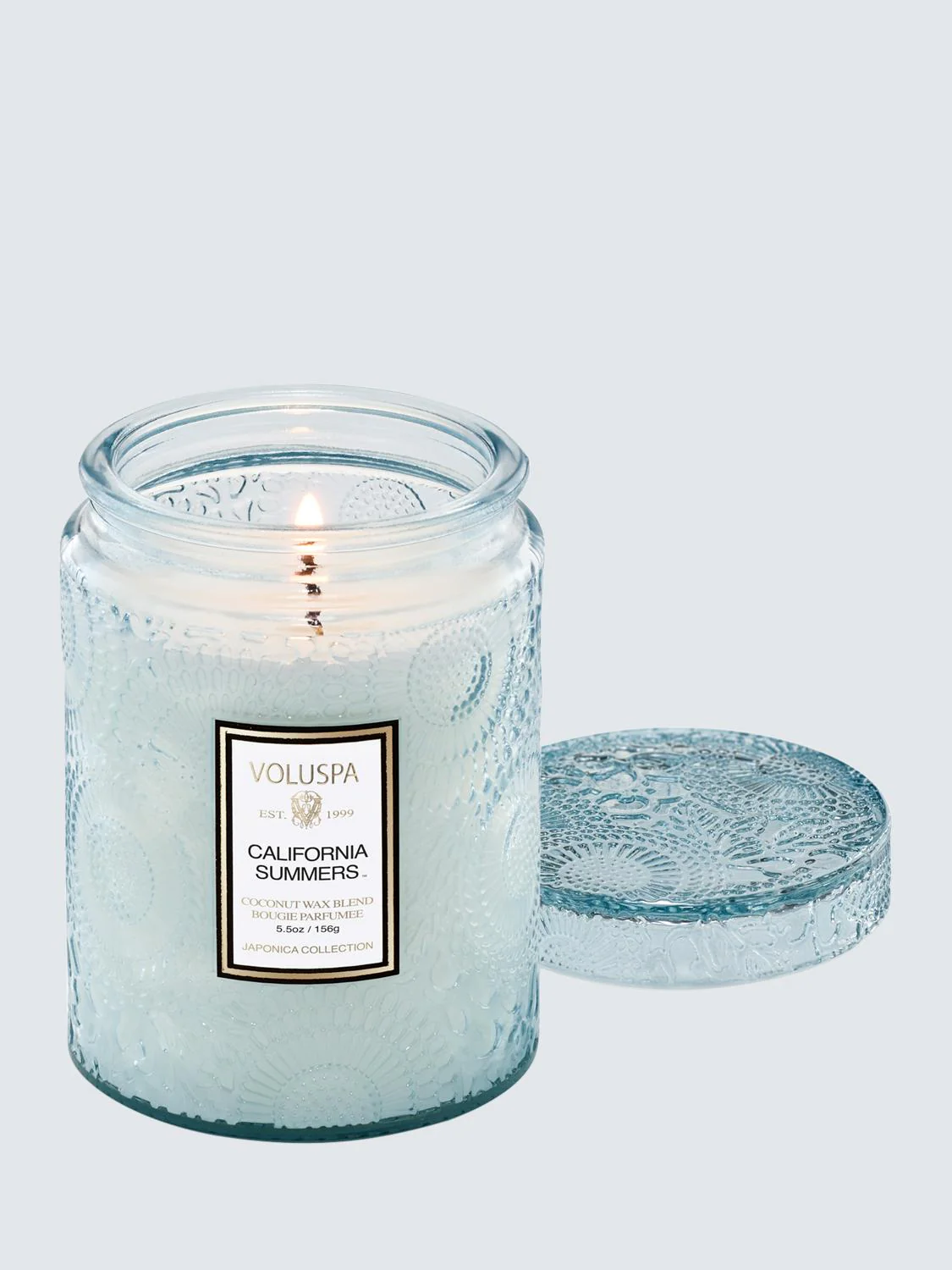 La exclusiva mezcla de cera de coco de Voluspa se presenta en un recipiente de vidrio grabado de 5.5 onzas y está rematada con una tapa a juego que mantiene la vela libre de polvo cuando no se utiliza.