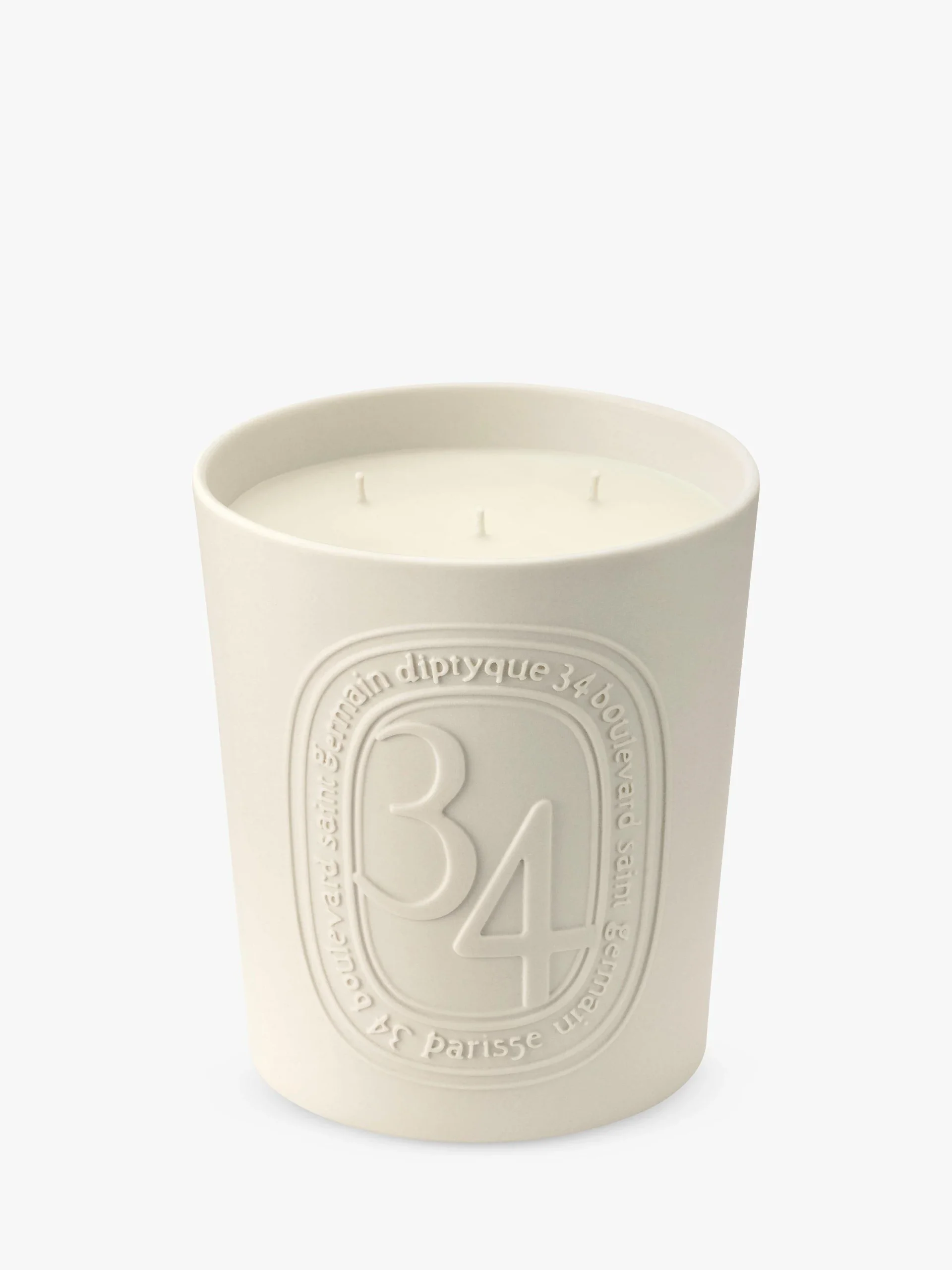 El emblemático óvalo del número 34 del Boulevard Saint Germain está grabado en un tarro de vela de porcelana biscuit blanca.
